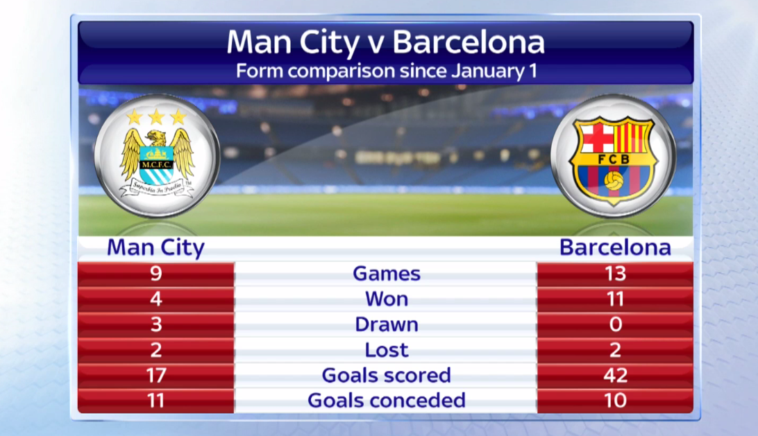 Manchester City heads into the first leg after crashing Newcastle with Five goals on Saturday to gain valuable points to follow league leaders Chelsea where as Camp Nou was handed a shock with a 1-0 defeat against Malaga which saw them falling behind the league leaders Real Madrid.