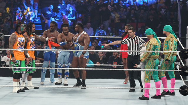 Los Matadores trade tags to get the best of Jimmy Uso. Fernando applies a chin lock, but Jimmy fights up and connects with an enzuigiri. Jey Uso tags in, as does Tyson Kidd on the other side. Jey hits him with a pair of clotheslines before kicking him in the midsection. Jey uppercuts him before dropping him with a Samoan Drop. Jey knocks Cesaro and the other Matador off the apron before connecting with a running hip bump on Kidd. Kingston then tags himself in. Kingston leaps over Jey and connects on Kidd with a cross-body block. Cesaro breaks up the pin. One of the Matadors accidentally knocks Cesaro out of the ring, and Woods clotheslines that Matador out of the ring. Woods gears up for a plancha, but Jimmy steals his thunder. Woods then takes Jimmy out with a summersault plancha.